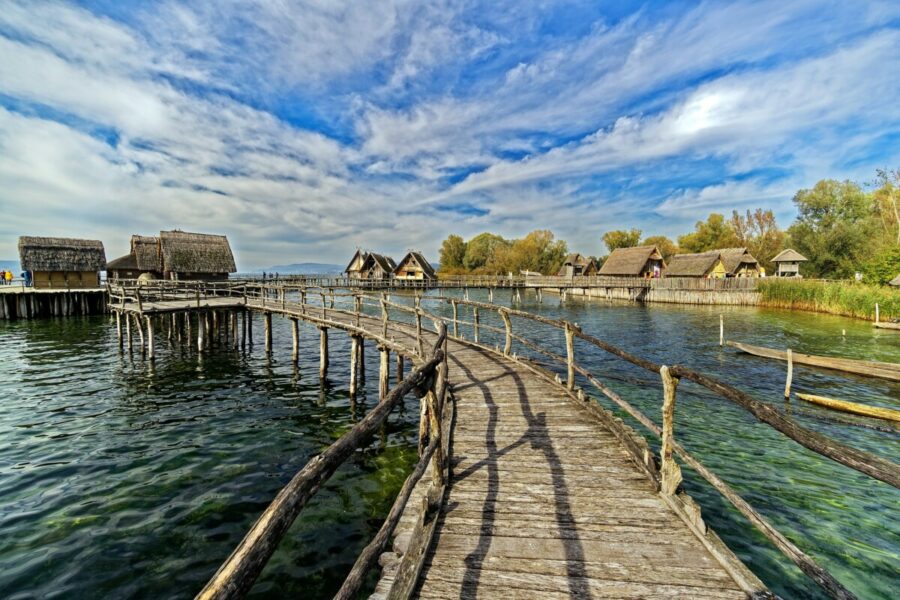 Als Beispiel für den Hausbau sollen hier die Pfahlbauten angeführt werden. Das sind Hütten auf meterhohe Pfähle. Dies hier ist eine Rekonstruktion im Pfahlbaumuseum Unteruhldingen am Bodensee: