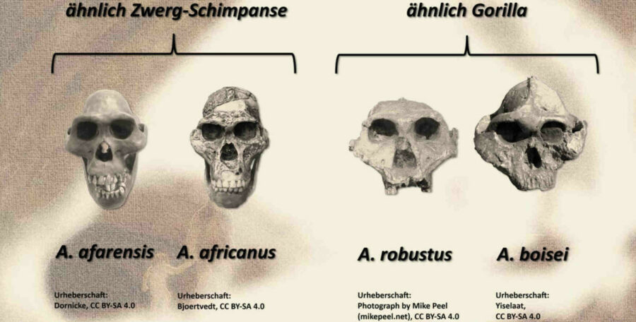 Der Australopithecus afarensis und der Australopithecus africanus sind dem Zwerg-Schimpansen ähnlich. Und dem Gorilla ähnlich sind der Australopithecus robustus und der Australopithecus boisei.