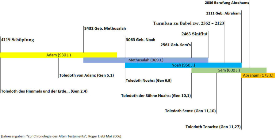 Unten in der Grafik seht ihr die Toledoth, bei welcher Bibelstelle sie vorkommen. Oben seht ihr, wann welches Ereignis war (Schöpfung, Sintflut, Turmbau zu Babel). Und in der Mitte fünf wichtige Personen, die in den ersten etwa 2100 Jahren gelebt haben, mit den Angaben wie alt sie geworden sind.