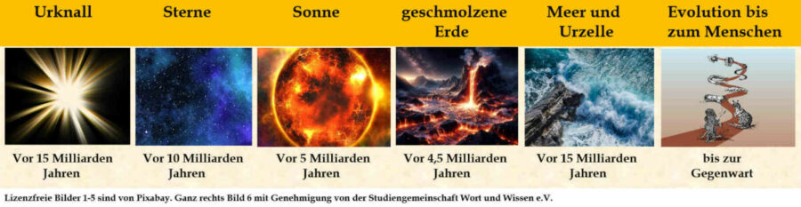 Nach der Lehre der Evolution soll das Universum durch einen sogenannten Urknall entstanden sein. Die weitere Entwicklung seht ihr sehr vereinfacht hier: