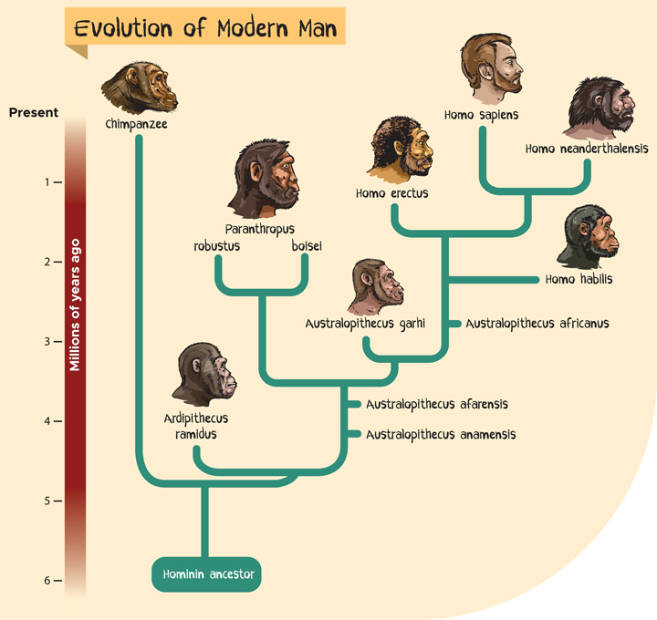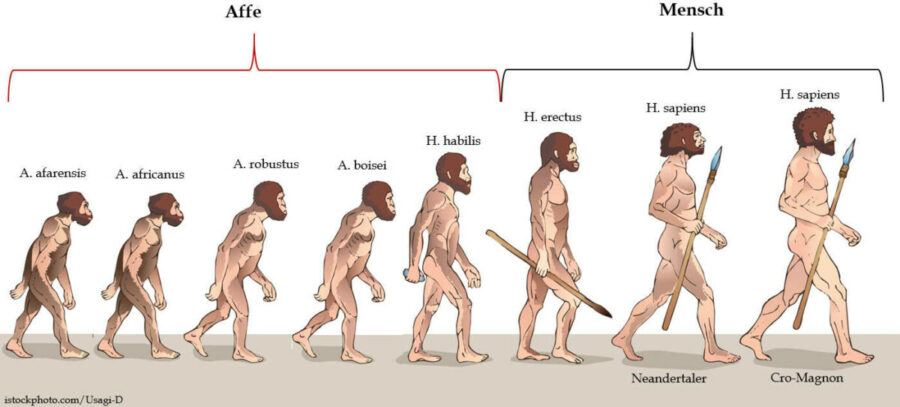 Die Entwicklung des Menschen soll ebenfalls Millionen von Jahre gedauert haben. Und man stellt sich wie folgt vor, wie der Mensch entstanden ist: