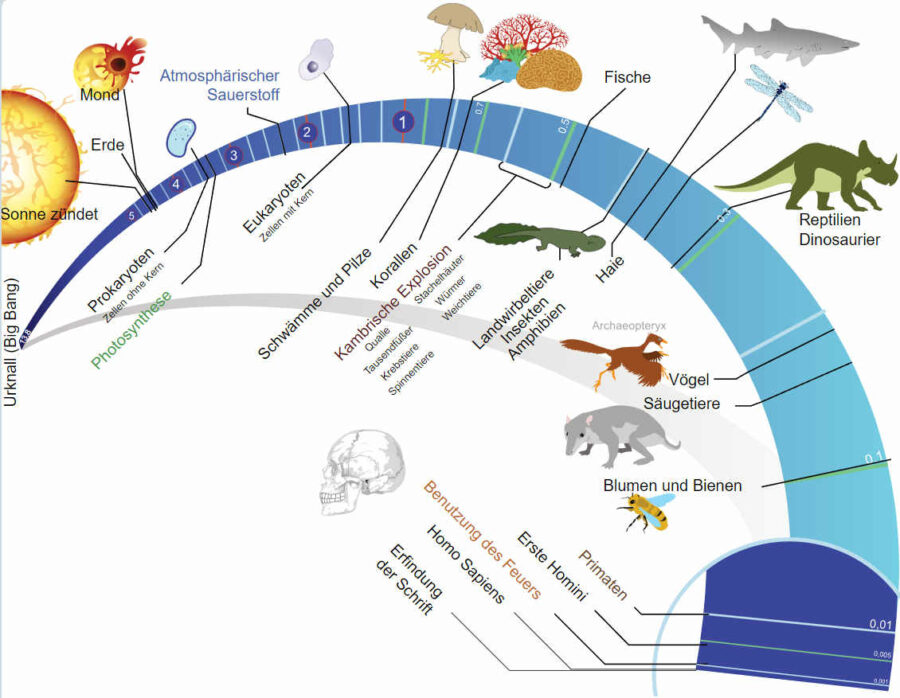 Wir haben im ersten Teil die Zeitleiste mit den Milliarden und Millionen von Jahren gehabt.