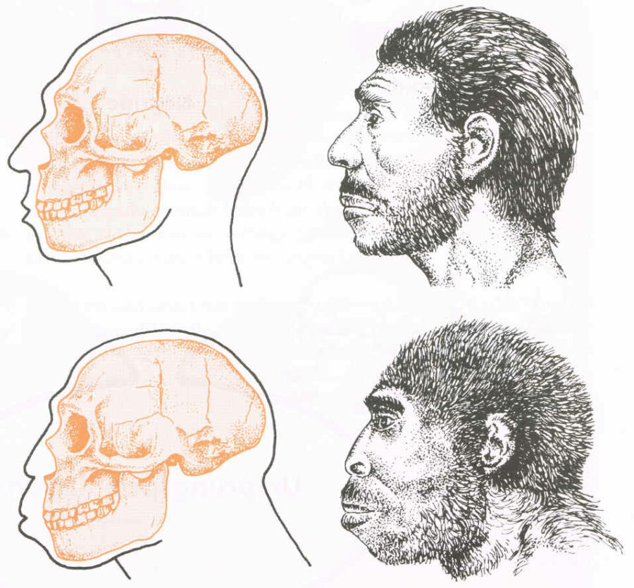 Zunächst müssen wir festhalten, dass wir nur Knochenfunde haben. Wir wissen nicht wie die Haare und wie die Haut und sonstigen Weichteile beschaffen waren. Wie wir beim nächsten Bild sehen, kann ich bei einem Schädelfund eine menschliche oder eine affenartige Nachbildung (Rekonstruktion) erstellen.