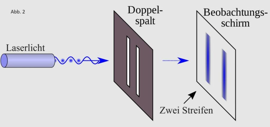 Wenn nämlich jemand beobachtet, durch welchen Spalt die Photonen gehen, dann verhalten sie sich wie gewöhnliche Teilchen und es gibt keine Interferenz mehr! Es entsteht dann das Muster, wie wir es in der nächsten Abbildung sehen.