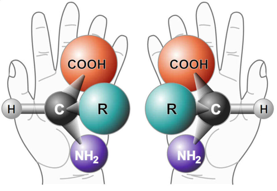 Für den Aufbau von Proteinen, die für das Leben notwendig sind, kommen nur die linkshändigen Aminosäuren (L-Aminosäuren) in Betracht.
